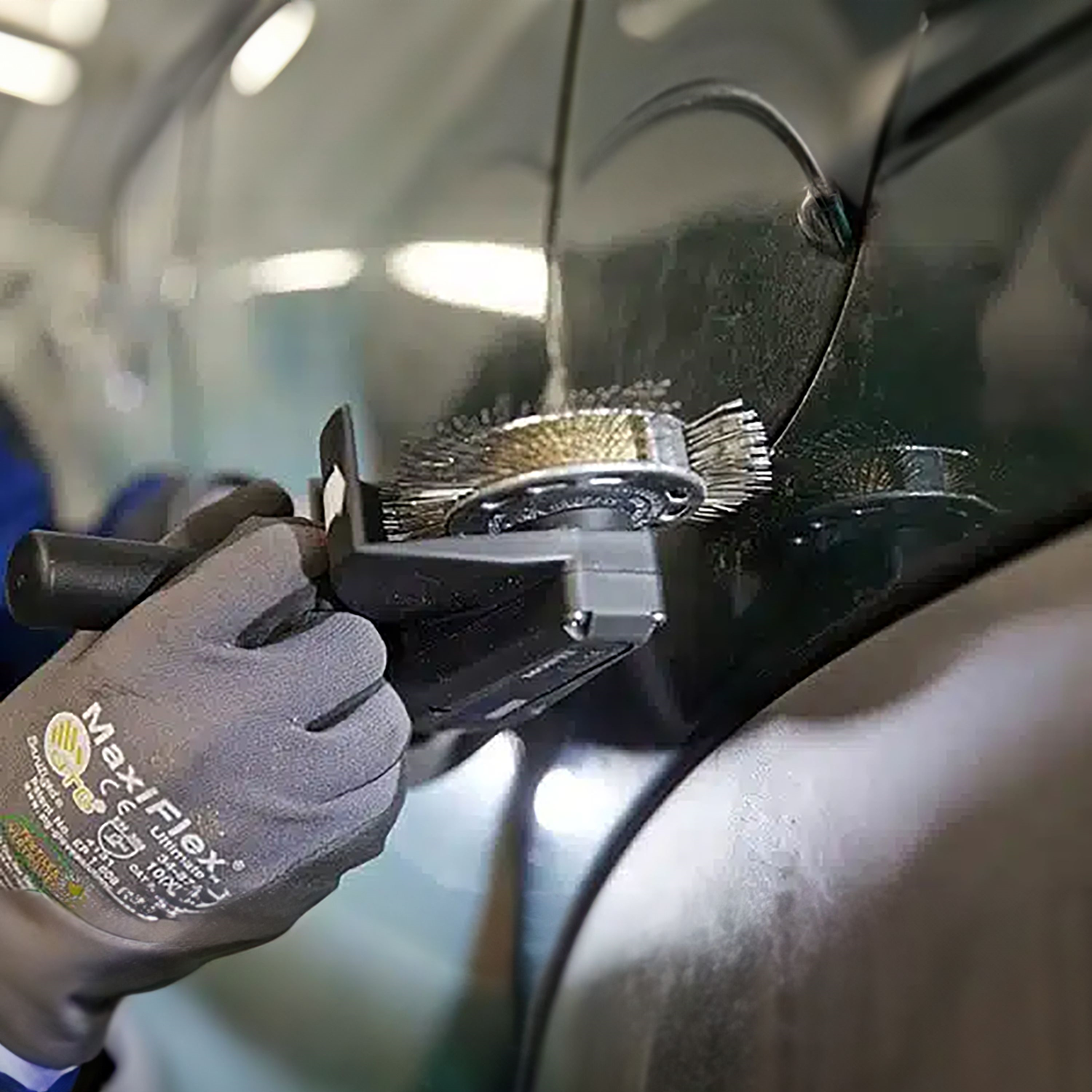 Elektrisches Werkzeug zum Entfernen von Rost, Korrosion, Oxidation, Klebstoffen, Dichtungen, Farbschichten, Grundierungen, Dichtungsmitteln, Vinyl und zum Abrichten von Schweissnähten in einem Arbeitsgang. Die Band mit flexiblen Drähten rotieren in einem patentierten Gehäuse und diese werden durch die Zentrifugalkraft nach aussen geschleudert, wo sie auf einem Luftpolster wirken. Die speziell entwickelten Borsten sind U-förmige Klammern, die durch einen haltbaren Nylongurt gesteckt sind und eine sichere, langlebige Leistung gewährleisten. - Entfernt schnell Korrosion und Oxidation, sowohl von hartem als auch weichem Material - Funktioniert auch auf unebenen Oberflächen - Hochflexibel in engen Bereichen - Kein Zusetzen oder Verkleben der Borsten - Kein Abschleifen oder Entfernen von Trägermaterial - Effizienter Schneidevorgang – erzeugt ein winkeliges Profil