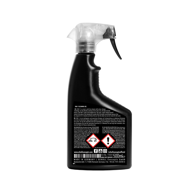 RIM-7 ist ein intelligenter und säurefreier Reiniger mit Farbumschlag zur mühelosen Reinigung von stark verschmutzten Felgen nahezu jeglicher Art. Die hohe Viskosität sorgt dafür, dass der Reiniger dort wirkt, wo man ihn aufsprüht und nicht davonläuft. Ein intelligenter Schmutzlöse-Indikator färbt das Reinigungs-Gel nach der optimalen Einwirkzeit (2-3 Minuten) lila und zeigt dem Anwender, dass man die Felge mit Wasser absprühen kann.