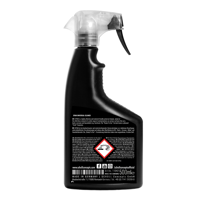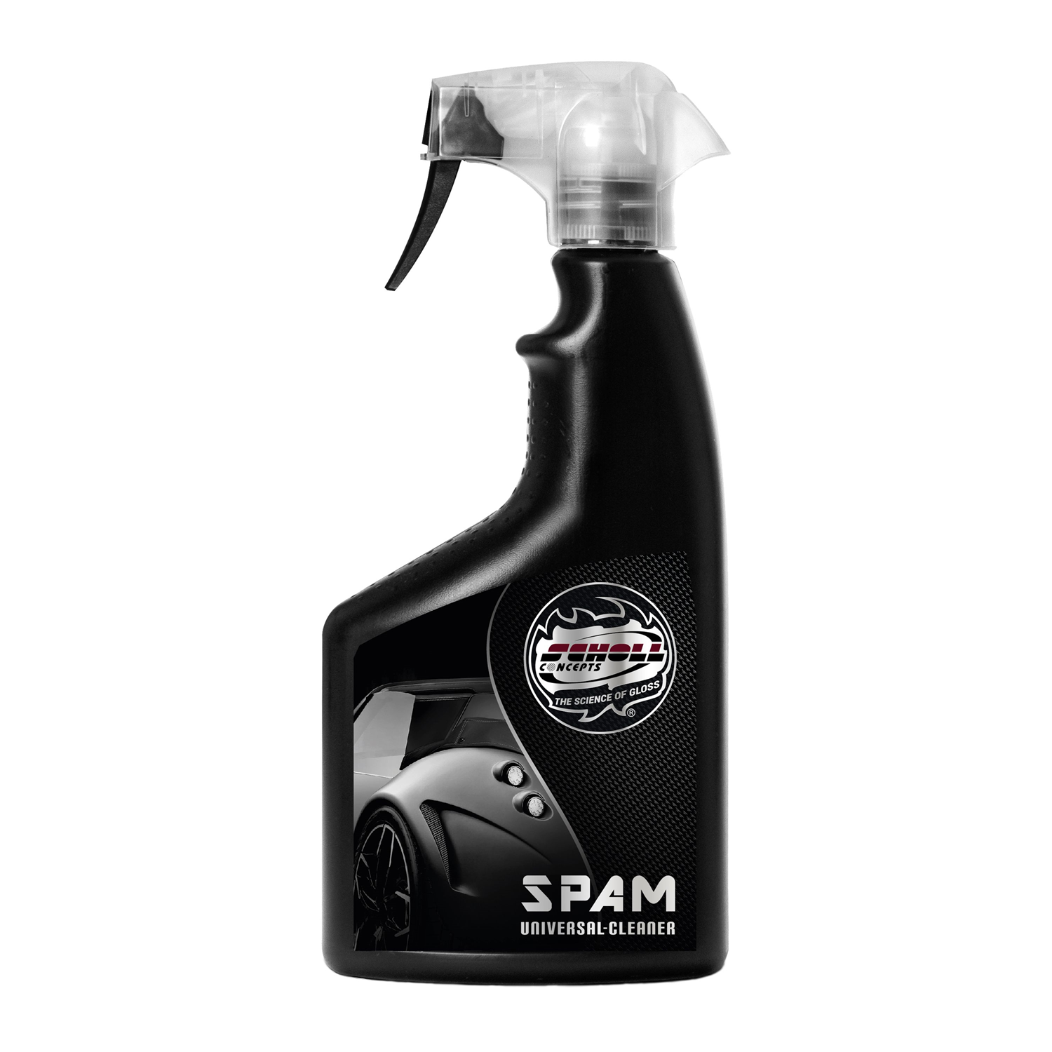 SPAM ist ein hochwirksamer und materialschonender Universalreiniger zur mühelosen Beseitigung unterschiedlichster Verschmutzungen auf nahezu allen Oberflächen im Kfz-, Boots-, Caravan-, Möbel- und Haushaltsbereich. Die „Ready To Use“ – Formulierung hinterlässt dabei einen angenehmen, frischen Duft.