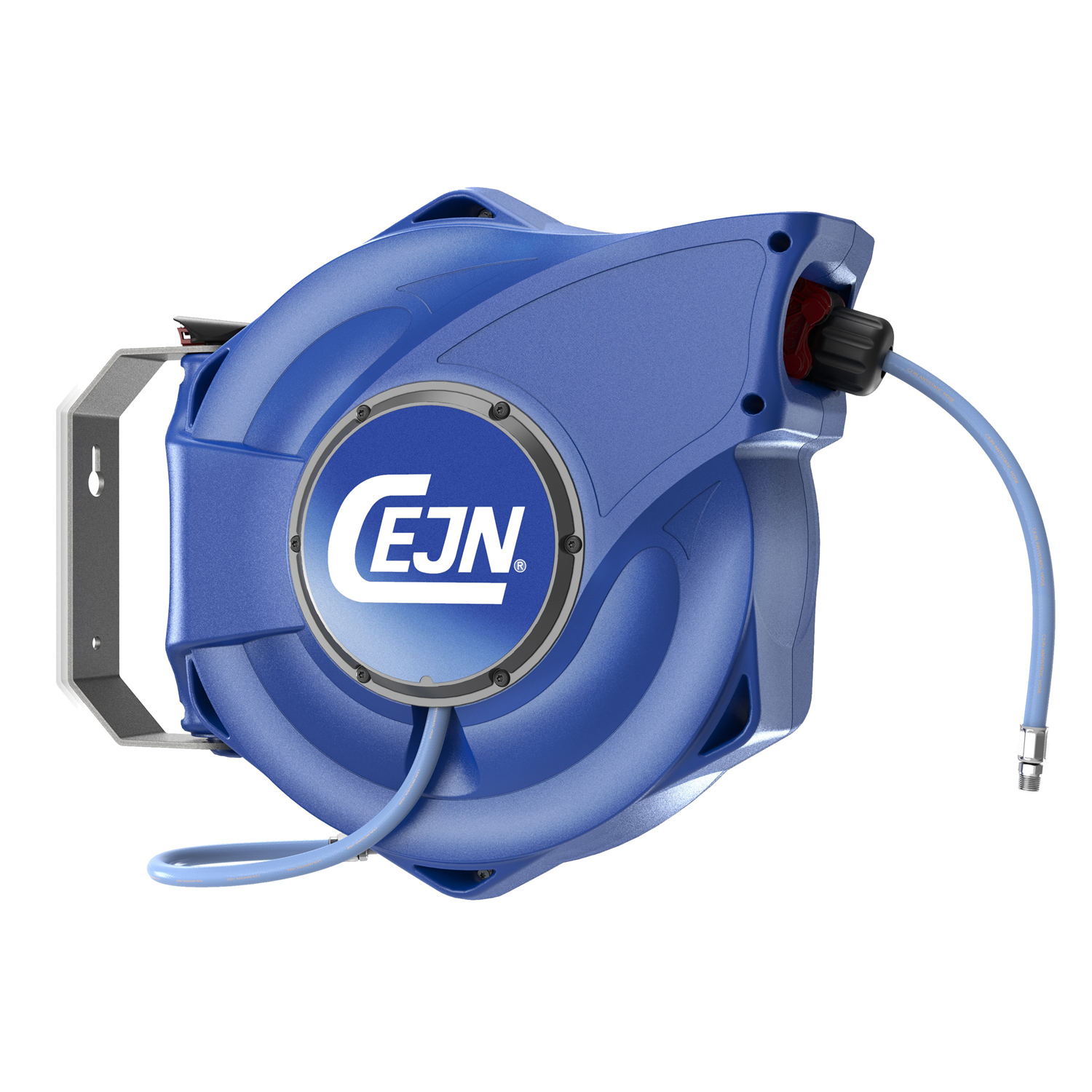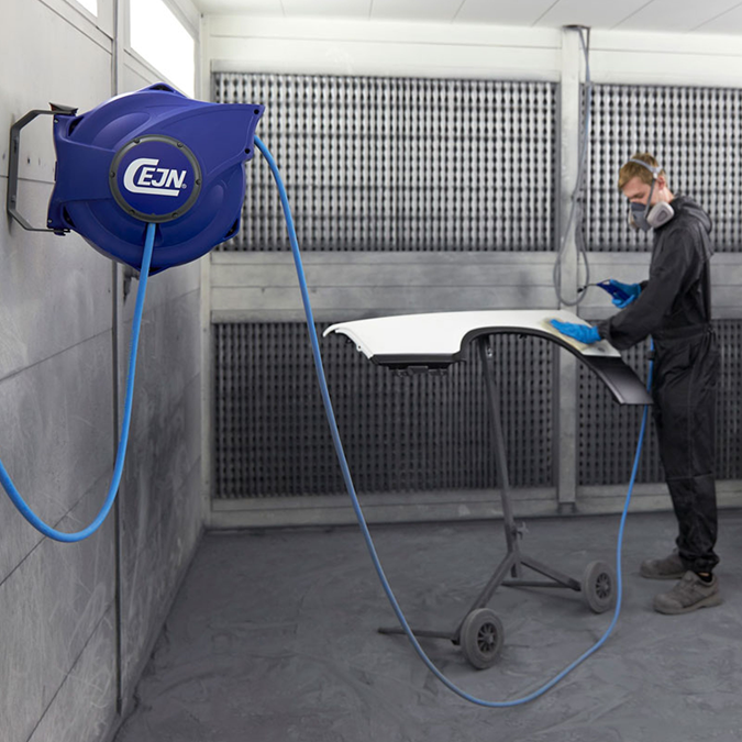 Sicherheis-Aufrollerfür für Druckluft mit antistatischem EPDM Schlauch Der CEJN-Schlauchaufroller für Druckluft ist ein langlebiger Schlauchaufroller, der – im Gegensatz zu den meisten anderen Schlauchaufrollern – dank seiner patentierten Konstruktion den Durchfluss nur minimal mindert. So erbringen die angeschlossenen Werkzeuge ihre volle Leistung, was Energie und Zeit spart. Der Schlauchaufroller von CEJN ist ideal für einen sicheren Arbeitsplatz. Die Funktion zum kontrollierten Einzug, die Schlauchführung, der Antistatische EPDM-Schlauch und der Knickschutz sind nur einige Beispiele dafür, was diese Sicherheits-Schlauchaufroller zu den besten auf dem Markt macht. Der Schlauchaufroller ist um 180° schwenkbar, damit sich der Anwender frei bewegen kann, und der kontrollierte Einzug macht ihn zu einer sicheren und praktischen Arbeitshilfe. Wenn der Schlauch gewechselt werden muss, ist dies dank der durchdachten Konstruktion besonders einfach möglich. Der sehr flexible, Temperatur und witterungsbeständige EPDM Schlauch ist perfekt geeignet für Lackierkabinen.