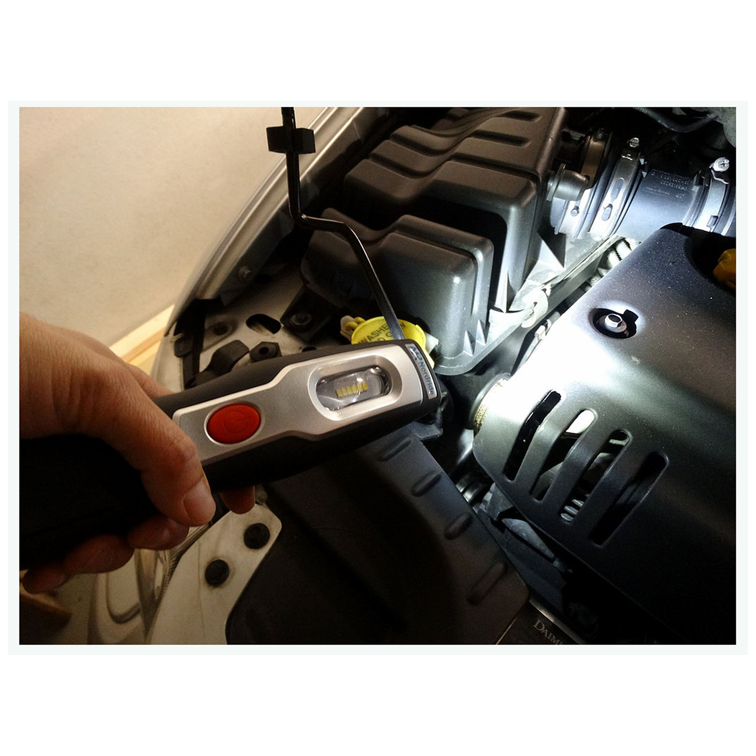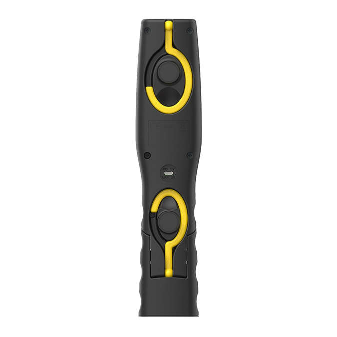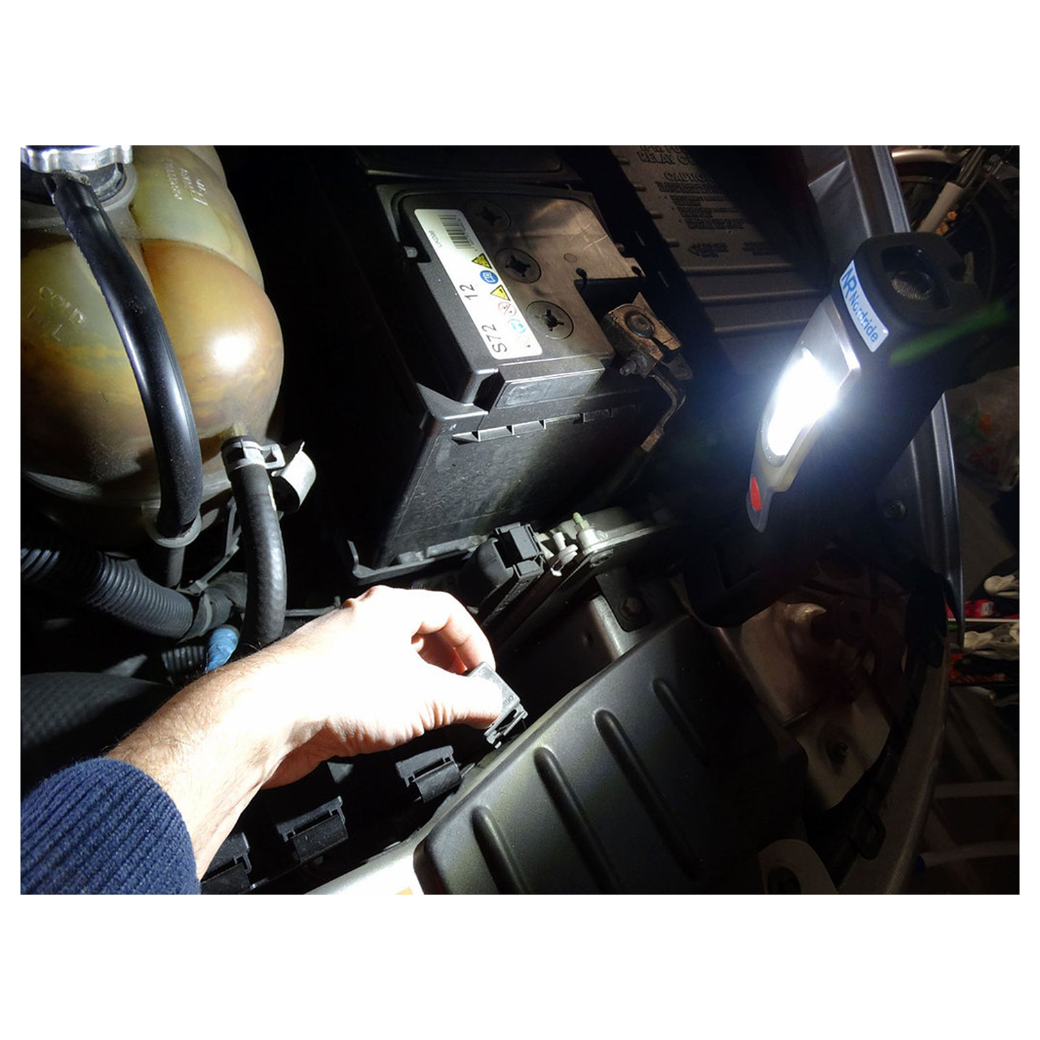 Wiederaufladbare SMD LED Arbeitslampe, leuchtstarke und gleichmässige Ausleuchtung (Linsentechnologie), Starke Seiten- und Frontlampe (350 / 100 Lumen), Flexibler Klappmechanismus mit Magnetfuss, 3 leistungsfähige Magnete für verschiedene Befestigungspositionen, 230 V + 12 V Ladegerät, Ladeanzeige (rot/grün), Ladezeit ca. 4 Stunden, Beinhaltet USB Kabel & 230V Netzstecker