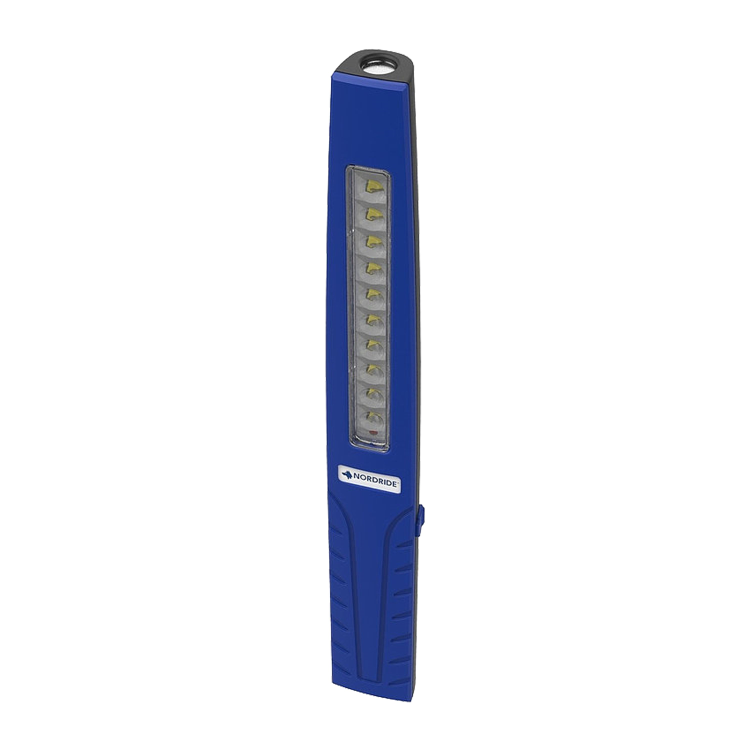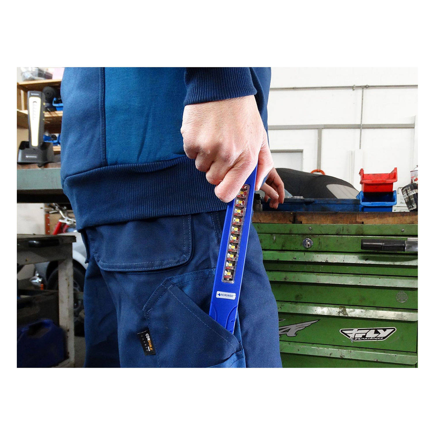 Wiederaufladbare SMD LED Arbeitslampe, Leuchtstarke 400 Lumen, Gleichmässige Ausleuchtung (Linsentechnologie), Seiten- und Frontlampe, 3 Funktionen (Spot/Frontlicht 100 lm, Hauplicht 400 lm, reduziert 200 lm, Passend in Metertasche, Eingebauter Magnet, Gummierter Griff, Ladeanzeige (rot/grün), Ladezeit 4-5 Stunden, Beinhaltet USB Kabel & 230V Ladegerät