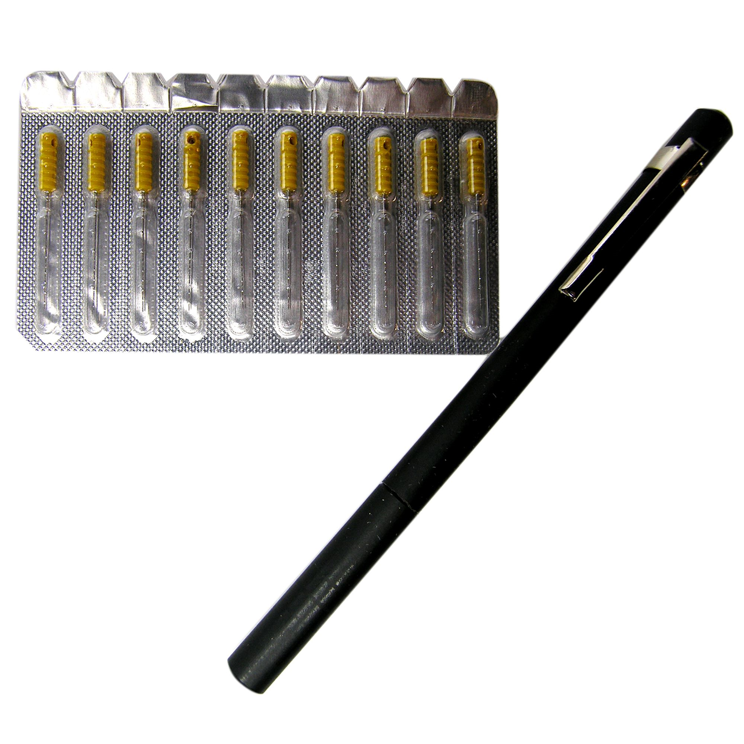 Satz bestehend aus 1 Haltestift und 10 Flusennadeln, einzeln verpackt. Die Nadeln haben mikroskopisch kleine Häkchen, mit denen man kleine Staubpartikel auf der feuchten Lackoberfläche entfernen kann.
