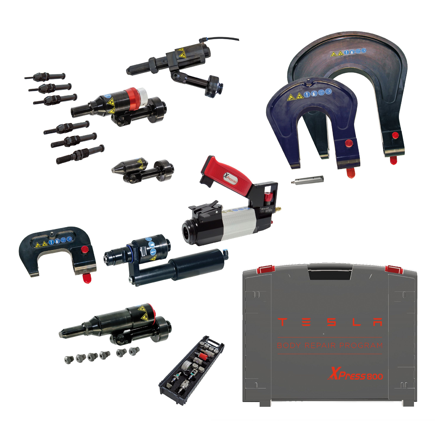 Hydro-pneumatisches System für Nieten mit Zubehör. Lieferumgang Europa Set: 1 x 700050 PowerPack | XPress 800 1 x 700105 PushPull PP 90 | Rückzugzylinder 1 x 700206 Tool Box RS-08 | Tesla 1 x 700209 Tool Box RS-11 | Tesla 1 x 700070 C-Bügel GC 80/40 1 x 700100 BR 20 Blindnietadapter 1 x 700101 BR 50 Blindnietadapter 1 x 881341 Handgriff für Fixmagnete & C-Bügel | rot 1 x 700080 C-Bügel | 4-teiliges Set im Koffer 1 x A700380 Koffer für XPress 800 | TESLA 1 x Bedienungsanleitung