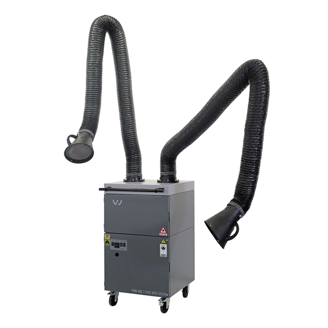 Unité mobile pour l'extraction et la filtration des fumées et des vapeurs de colle générées lors de l'assemblage et de la découpe thermique des métaux et des plastiques. Dans la section de filtration du système, les grosses particules de poussière sont d'abord séparées sur le tapis de pré-filtration. Le filtre à particules qui suit élimine également les fumées et poussières fines. Un système de contrôle automatique des filtres indique quand il est nécessaire de les nettoyer ou de les changer. L'unité est équipée de deux bras d'extraction de tuyau avec des joints internes. Un nouveau type de support à ressort à l'intérieur des bras d'extraction permet d'ajuster facilement les bras dans n'importe quelle position. La hotte d'aspiration avec vanne d'étranglement intégrée peut être pivotée dans n'importe quelle direction et l'air purifié est renvoyé dans la zone de travail. Pour l'application vapeurs de colle, un filtre supplémentaire à charbon actif est utilisé, qui retient les gaz et les odeurs désagréables.