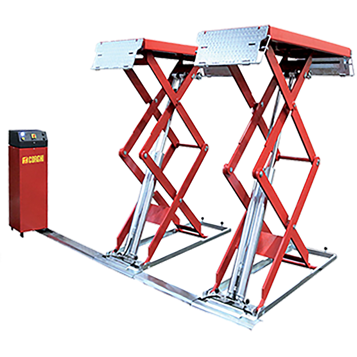 Elévateur d'essieu à ciseaux double électrohydraulique pour les marchands de pneus, les ateliers de réparation automobile et les carrossiers. Alignement des rails de roulement par une double paire de vérins et système MASTER/SLAVE sans crémaillère. Rails de roulement en version avec rallonge ou volets.