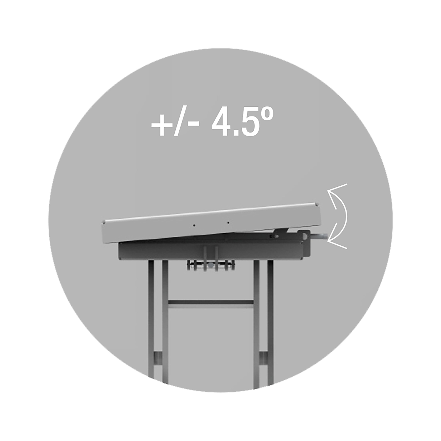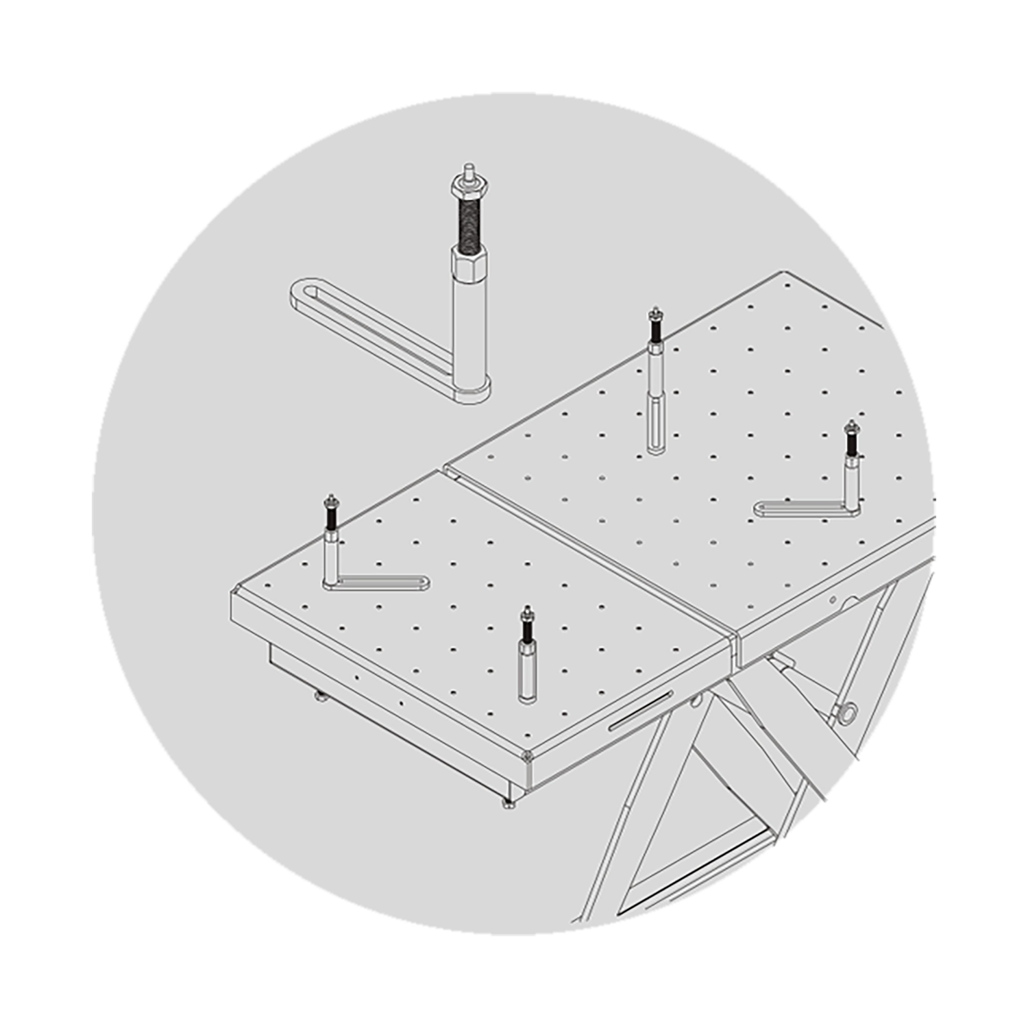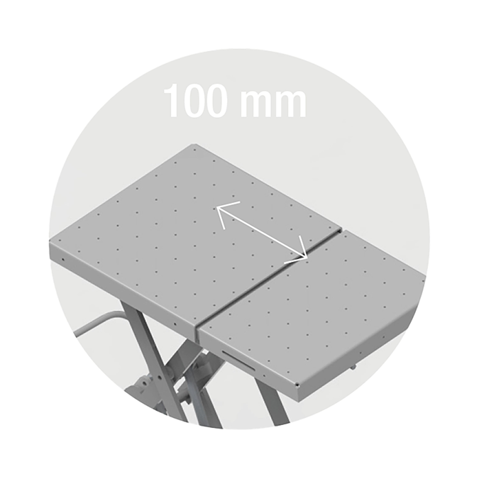 -table extensible et inclinable jusqu'à 100mm dans les deux axes, facilitant la séparation des composants -hauteur maximale de 1,8m aidant au démontage facile et confortable des batteries et moteurs -surface perforée et filetée avec un motif de 100x100mm pour le placement d'outils et de supports