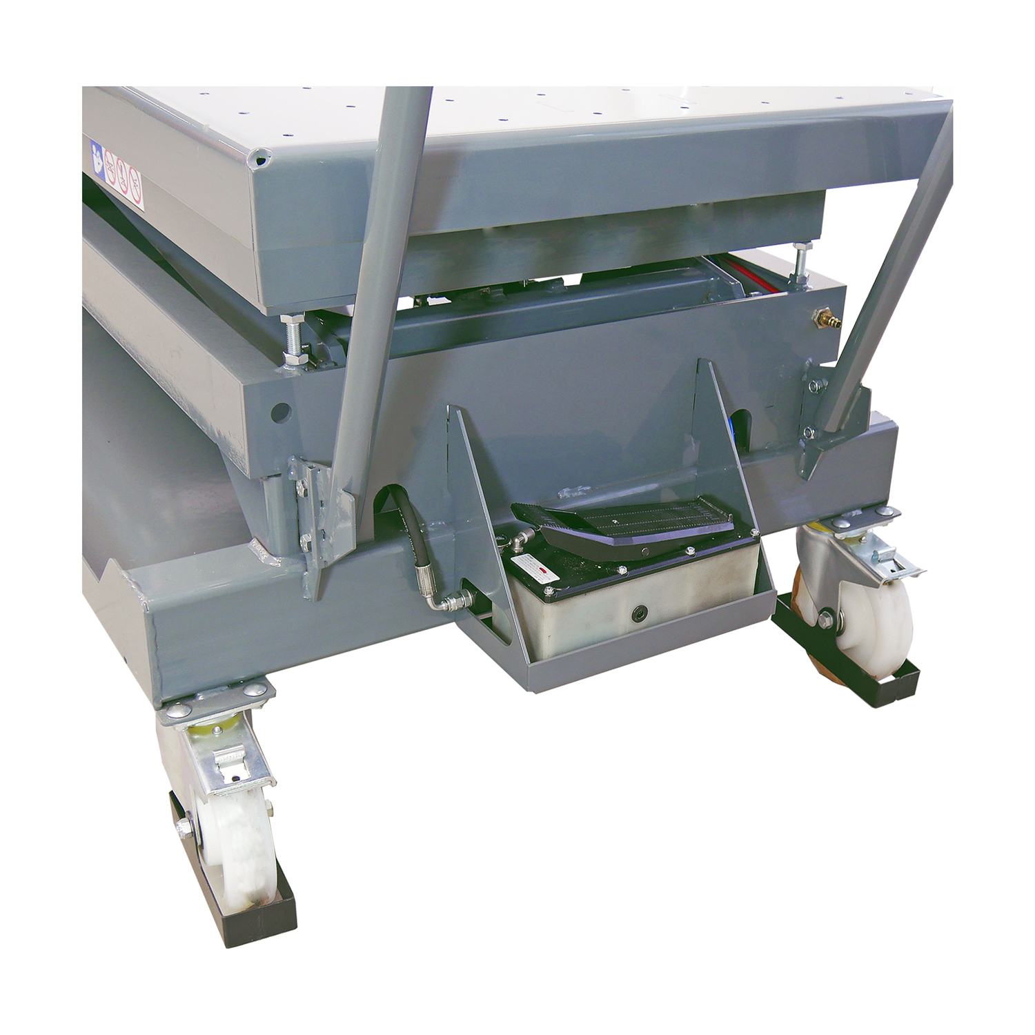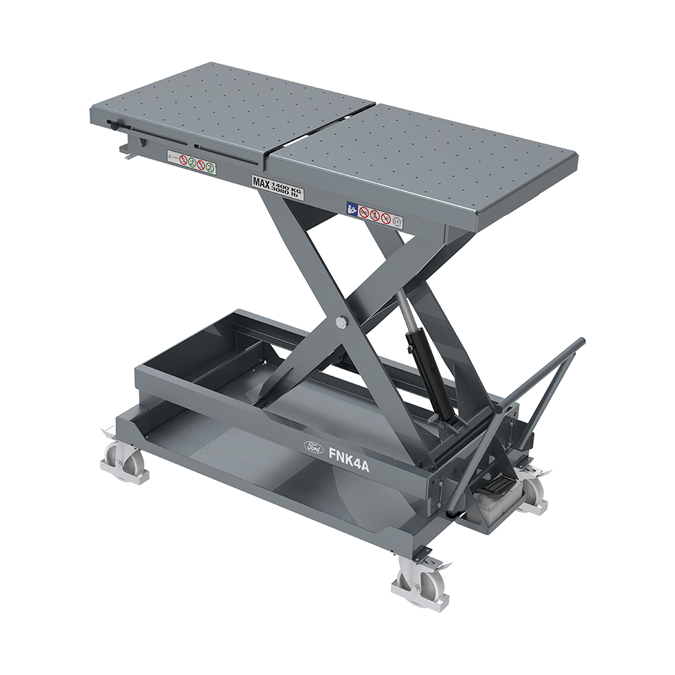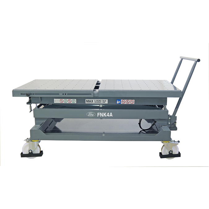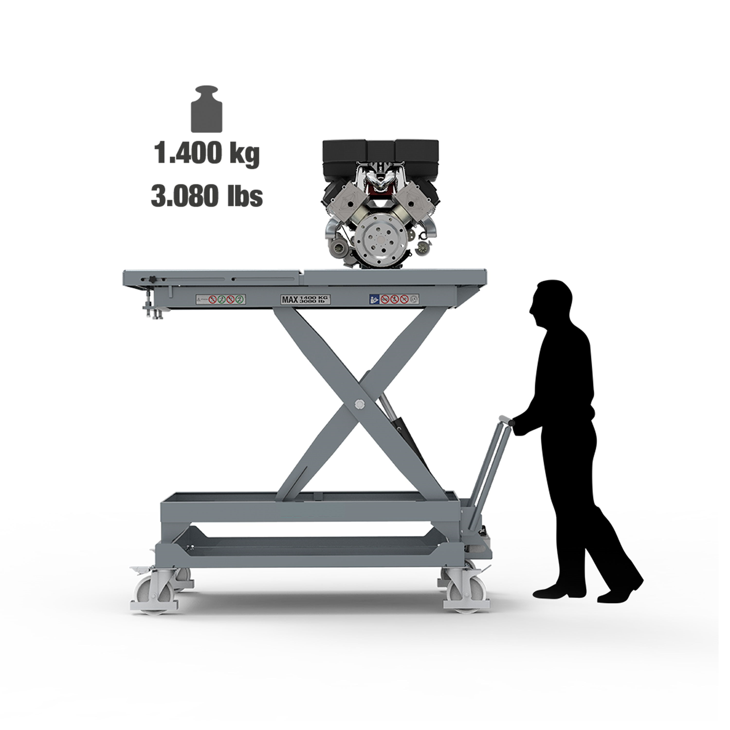 Table élévatrice mobile pour l'atelier de démontage et de dépose des batteries de véhicules électriques.- Charge maximale sur la surface de stockage 1,4 tonnes- hauteur réglable de 800 à 1800 mm- extension de la table de 1830 à 2130mm- Configuration des trous de la surface de stockage 100 x 100mm- inclinaison latérale de la surface de stockage +/- 4,5°.- Hauteur inclinaison de la surface de stockage +/- 1 °- 4 roulettes pivotantes avec frein de blocage