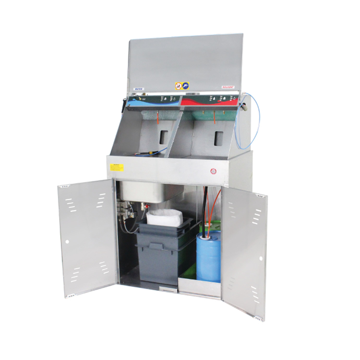 Appareil combiné, lavage manuel peinture à l?eau et peinture au solvant - aspiration automatique des vapeurs de la zone de travail - ZONE EAU : - prélavage avec pinceau alimenté par une pompe en utilisant le liquide de recirculation - lavage final avec nébuliseur en utilisant de l?eau propre - pistolet de soufflage pour le séchage final - kit de séparation eau-peinture inclus - ZONE DILUANT : - prélavage avec pompe venturi en utilisant le diluant de recirculation - pompe venturi pour puiser le diluant propre - lavage final avec nébuliseur en utilisant diluant propre - possibilité d?effectuer des essais de couleur - entièrement en acier inox - ATEX II 2G ?capacité de la cuve d?eau 50L ? option: Kit M pour zone diluant
