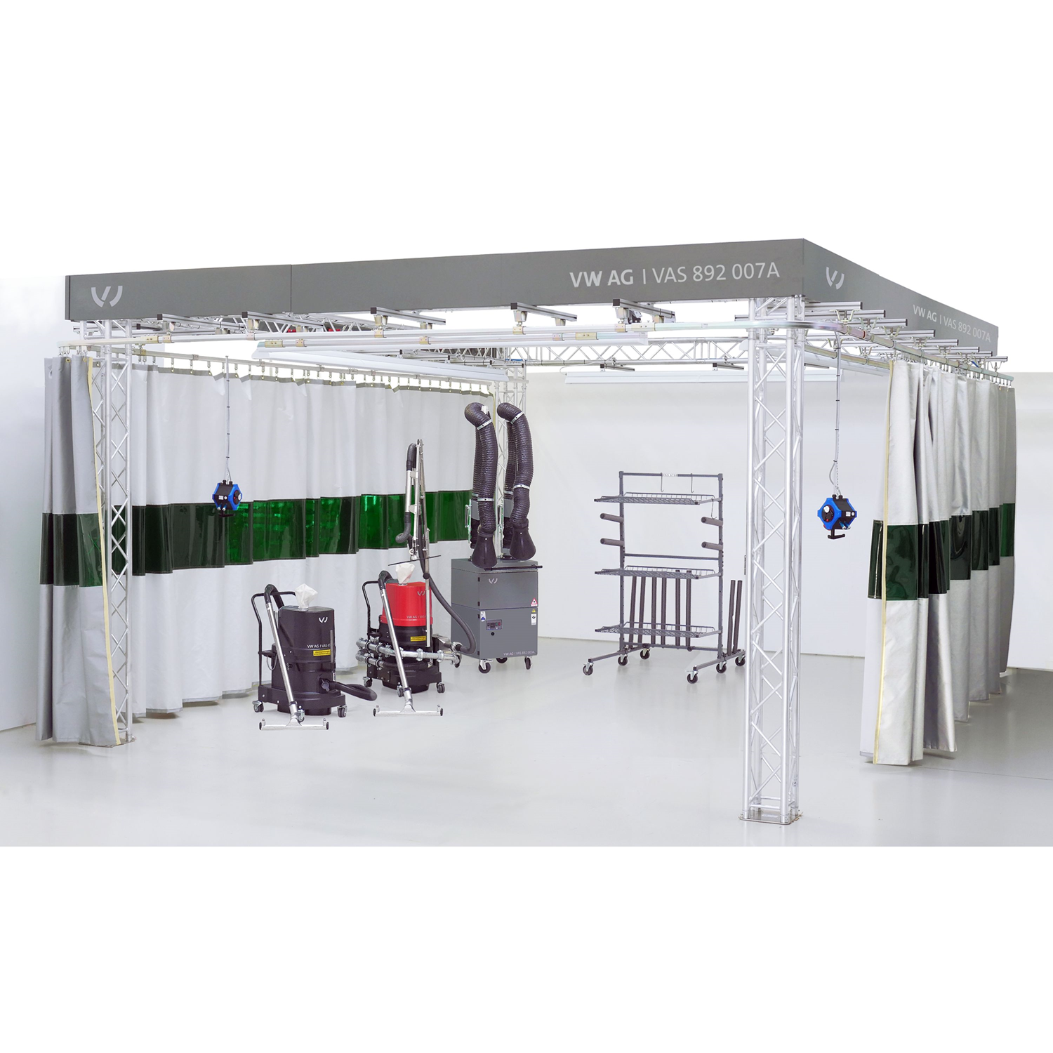 Avec le système de zones de travail Profi pour carrosseries, la réparation de véhicules de construction mixte peut être effectuée de manière fiable, conformément aux spécifications de réparation. La zone de travail sur la carrosserie est séparée de la zone environnante par un rideau de protection de soudure spécialement revêtu. Grâce à la lamelle verte intégrée, les personnes non impliquées sont protégées de manière optimale contre les dangers de la soudure. Le rideau et un système d'éclairage à LED sont fixés à un système de traverse en aluminium de haute qualité. Le système d'éclairage à LED assure des conditions d'éclairage optimales et se caractérise également par une efficacité énergétique et une robustesse élevées. L'alimentation en air comprimé et en énergie est assurée par deux unités d'alimentation fixes, installées toutefois selon les souhaits et dotées d'un boîtier en caoutchouc robuste. La livraison comprend un système d'aspiration pour les poussières d'aluminium / CFRP avec piège à étincelles, un bras d'aspiration télescopique ainsi qu'un système d'aspiration pour les poussières d'acier, un système d'aspiration mobile pour les fumées de soudage et fumées de colle et les filtres correspondants.