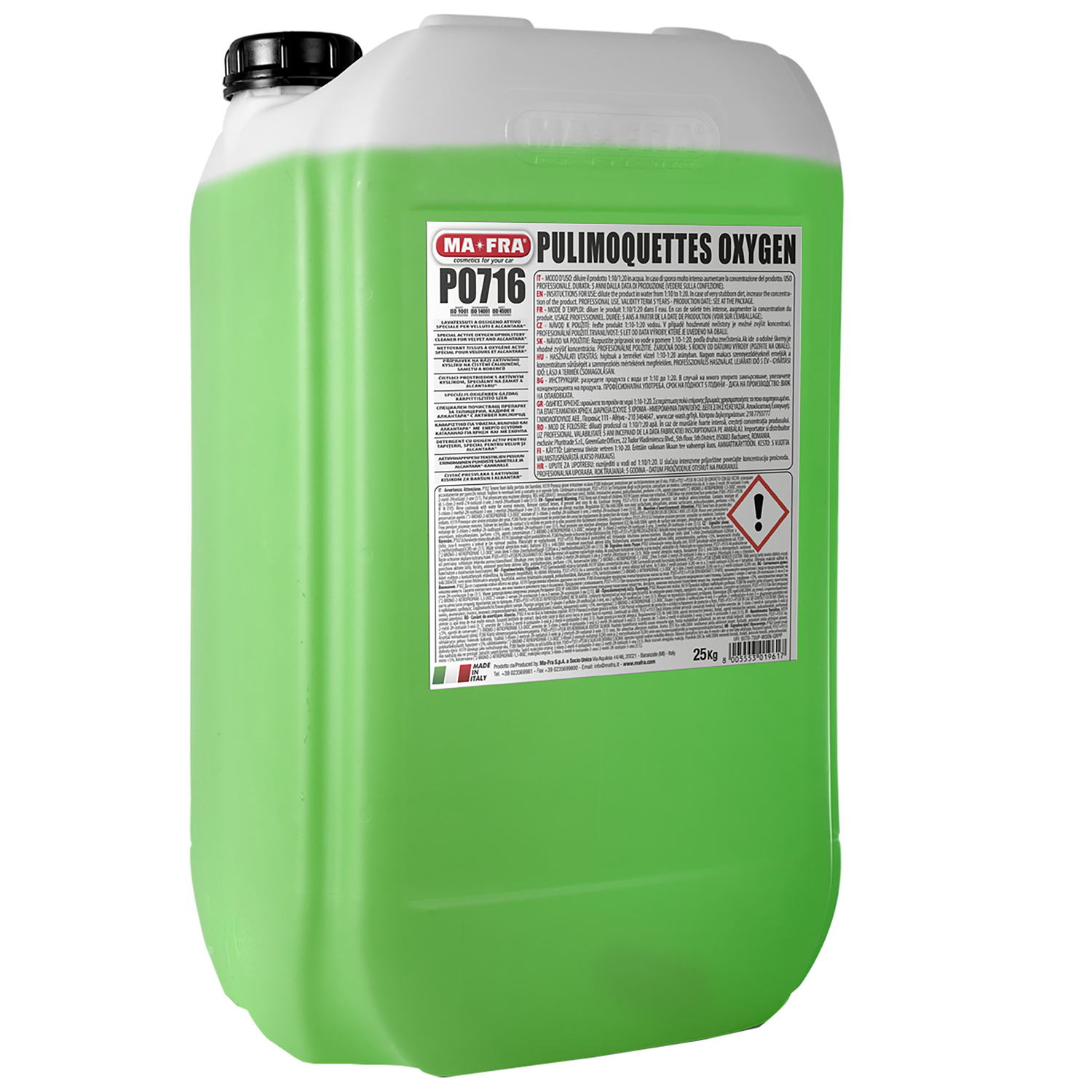 Détergent parfumé spécial tissus velours et alcantara. Champ d’application: Détergent délicat hautement concentré à mousse freinée, il nettoie à fond n'importe quel type de tissus, velours et moquettes. Avantages: Grâce à ses caractéristiques, il permet d’obtenir d’excellents résultats tant dans les installations de lavage par extraction, que manuellement, et il garantit le maximum de propreté même sur la saleté la plus résistante tout en libérant un agréable parfum. Mode d’emploi et dilutions: Diluer le produit dans de l’eau dans une proportion de 1:10 à 1:20 en fonction de l’intensité de la saleté à traiter.