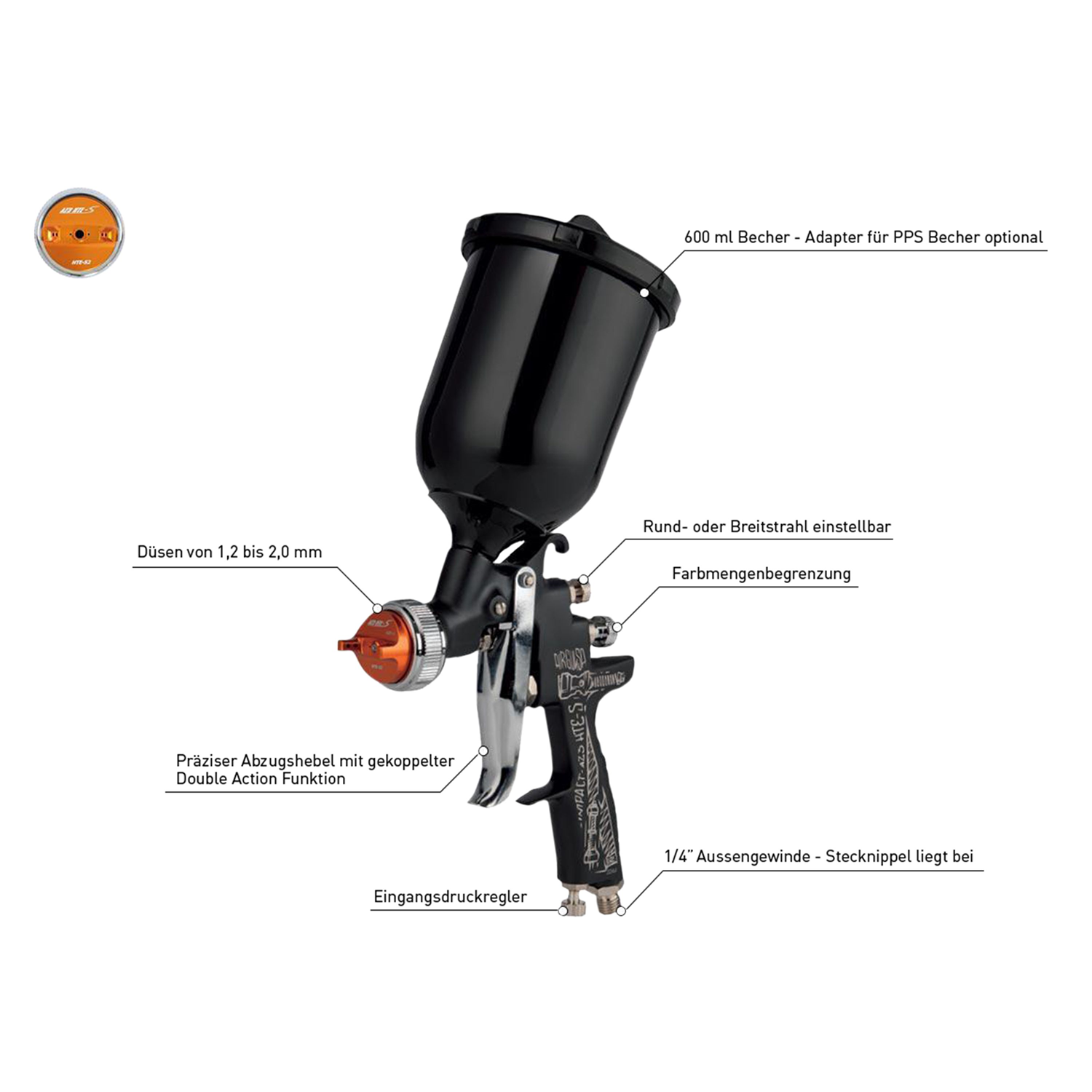 - Nouveau chapeau haute performance HTE-S - Excellent confort grâce à sa crosse ergonomique - Passage produit entièrement en INOX - Haut taux de transfert - Mouvement souple de la gâchette - Facile à nettoyer grâce à son corps en aluminium poli - Coût d'entretien réduit: peu de pièces détachées (pièces compatibles avec l'AZ3 HTE 2)