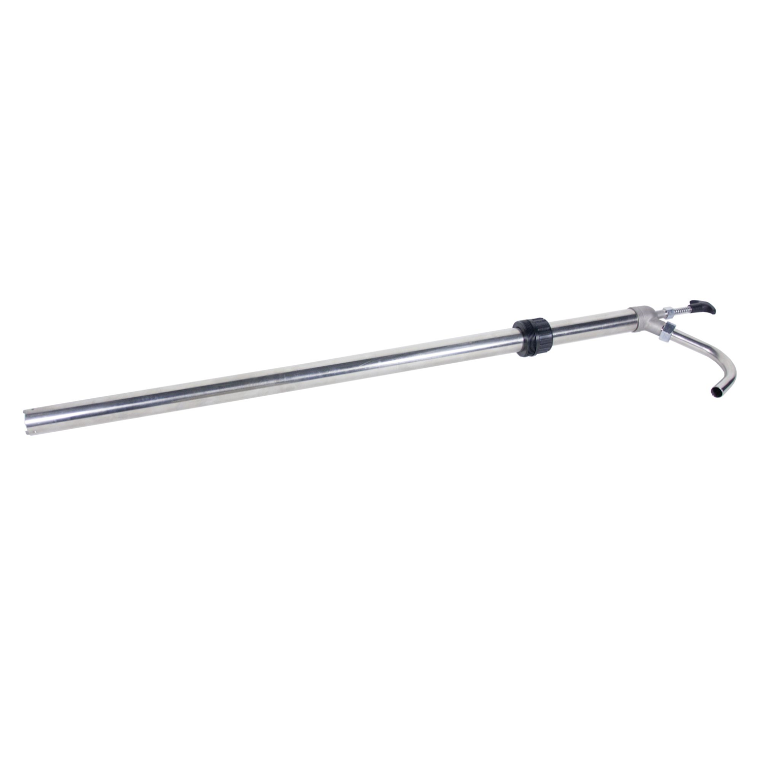 Pompe vide-fûts en tube d'acier avec coude de sortie pour fûts 60/200/220 l, tube d'aspiration télescopique 480-900 mm, fluides véhiculés : huiles jusqu'à SAE 90, fluides autolubrifiants non agressifs, antigel non dilué, fioul, diesel, pétrole, débit : 0,3 l/course