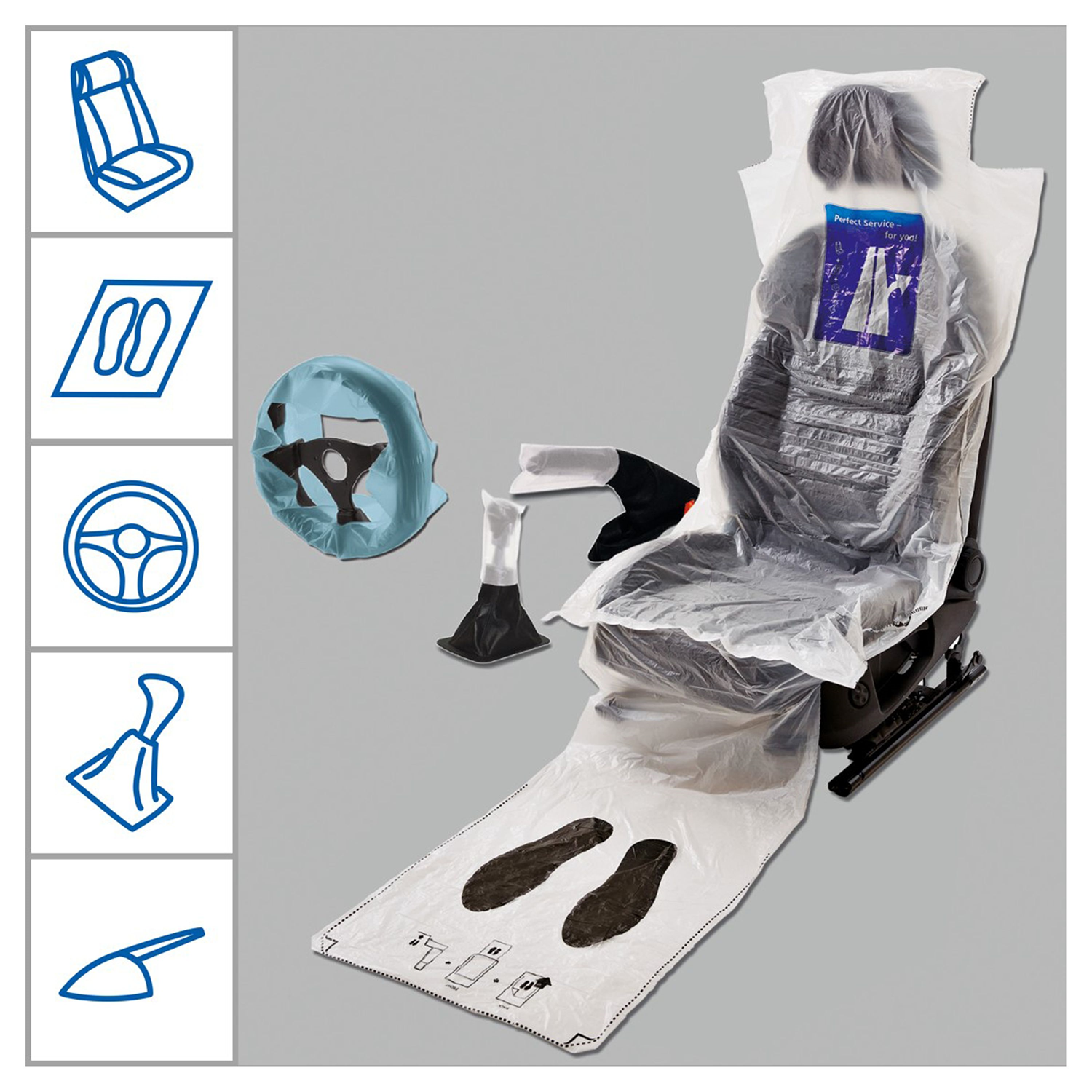 La protection complète et parfaite pour l'intérieur de la voiture avec 5 éléments de protection de haute qualité en 1 jeu. Eléments 1 et 2 : Housse de protection et protection de sol en une seule pièce - ajustement parfait de la housse de protection et du tapis de sol grâce à la face inférieure antidérapante - la zone étroite de la tête permet de voir dans l'angle mort lors des essais routiers ou des man?uvres en marche arrière - aucun glissement du paillasson possible car il est fixé par la housse de protection. Dimensions: housse de siège 880 x 1500mm - paillasson 510 x 700mm. Elément 3 : Protecteur de volant antidérapant - film spécial, bleu transparent, inséré séparément - très extensible, antidérapant - adapté aux volants des véhicule pour particuliers - s'adapte de manière élastique à la forme du volant. Dimensions: 490 x 150mm. Élément 4 : Protection du levier de vitesses - capote de protection blanche - universelle - convient à tous les types de leviers de vitesses. Elément 5 : Protection du frein à main: capote de protection blanche - universelle - adapté à tous les types de frein à main. A partir de 6 rouleaux également disponible avec votre logo (max. 30x30cm, excl. prix de cliché, 1 couleur CHF 200.--, 2 couleurs CHF 400.--, 3 couleurs CHF 600.?)