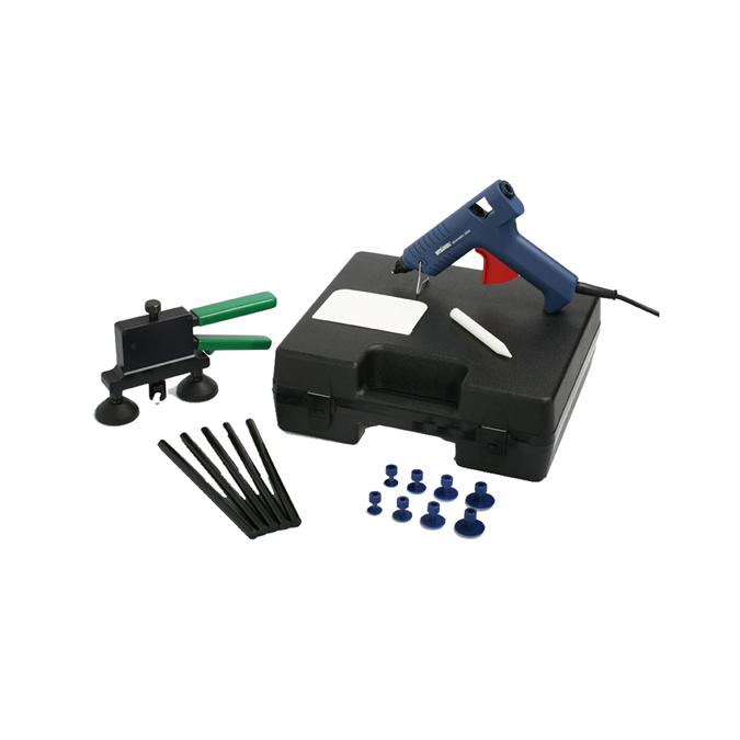 Le set de débosselage fondé sur la technique de collage permet un accès bon marché dans la technique de débosselage sans abîmer la peinture. De plus, le set de débosselage constitue le complément idéal au levier de débosselage. Les petites déformations non-accessibles de l'intérieur peuvent être à présent réparées de l'extérieur, sans abîmer la peinture, grâce à la technique de collage. La méthode est simple : au milieu de la déformation, on colle un adaptateur à l'aide d'une colle spéciale. À l'aide de la pince Dent Lifter, la bosse est soigneusement éliminée dans un mouvement contrôlé. Contenu : 10 bâtons de colle (noir), 5 champignons de débosselage (15, 20, 25, 30 mm), 1 masse coulissante, 1 pistolet à colle à chaud, 1 aérosol de nettoyage, en coffret.